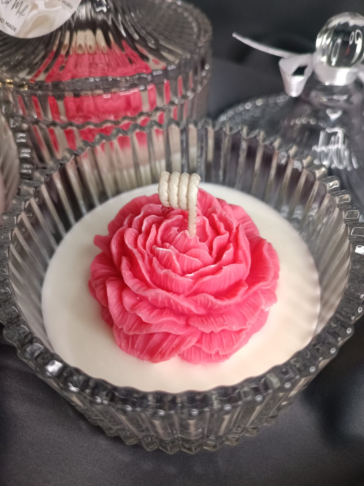 Svíčka v křišťálové dóze zdobená něžným květem, který provoní prostor jemnou jahodovou vůní.