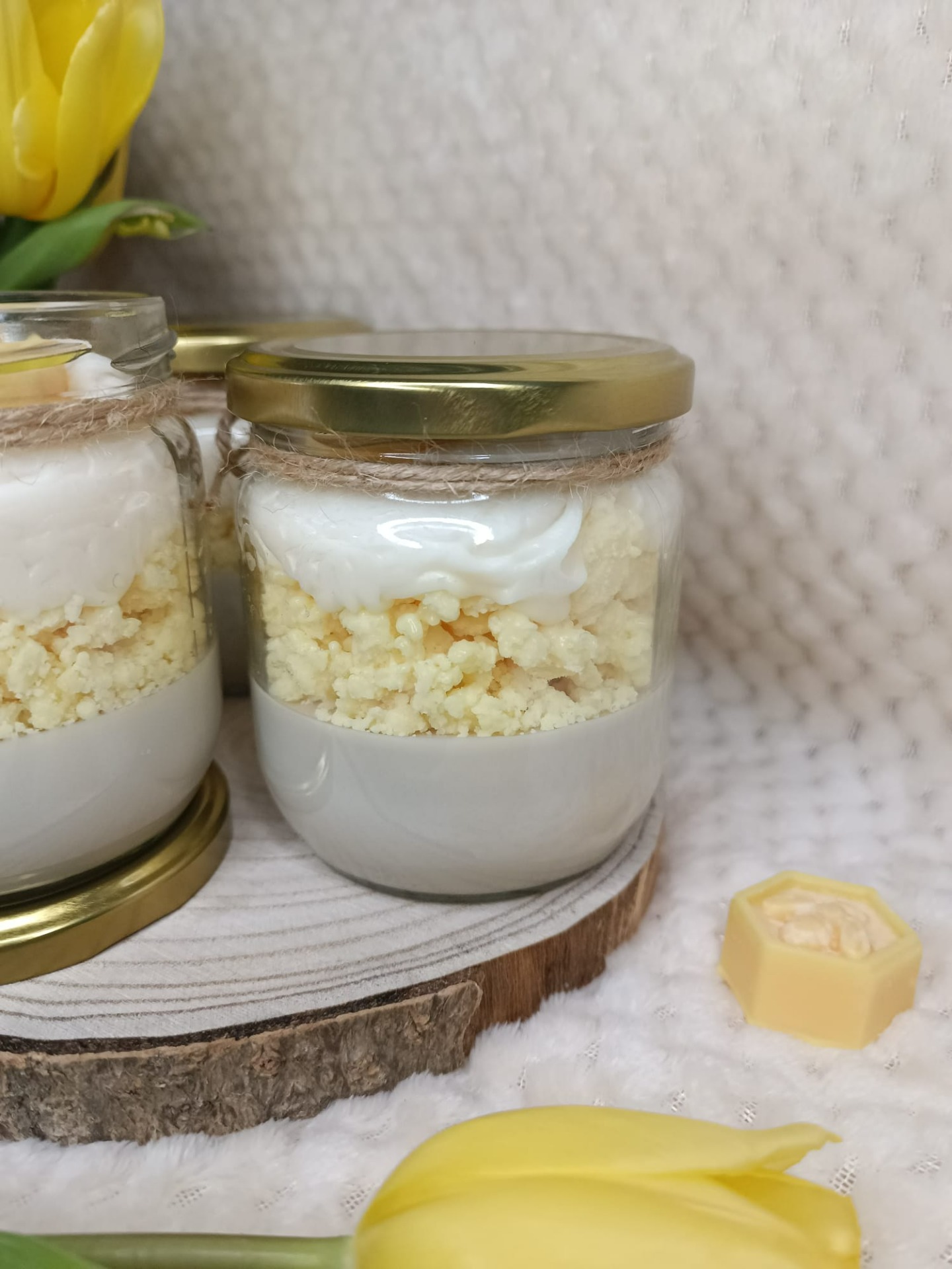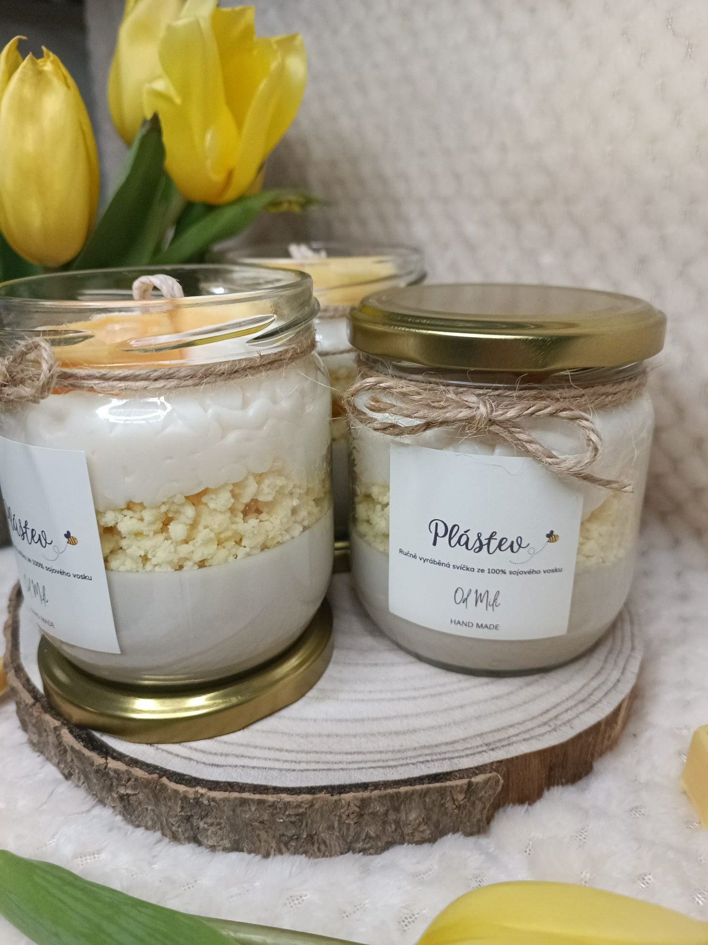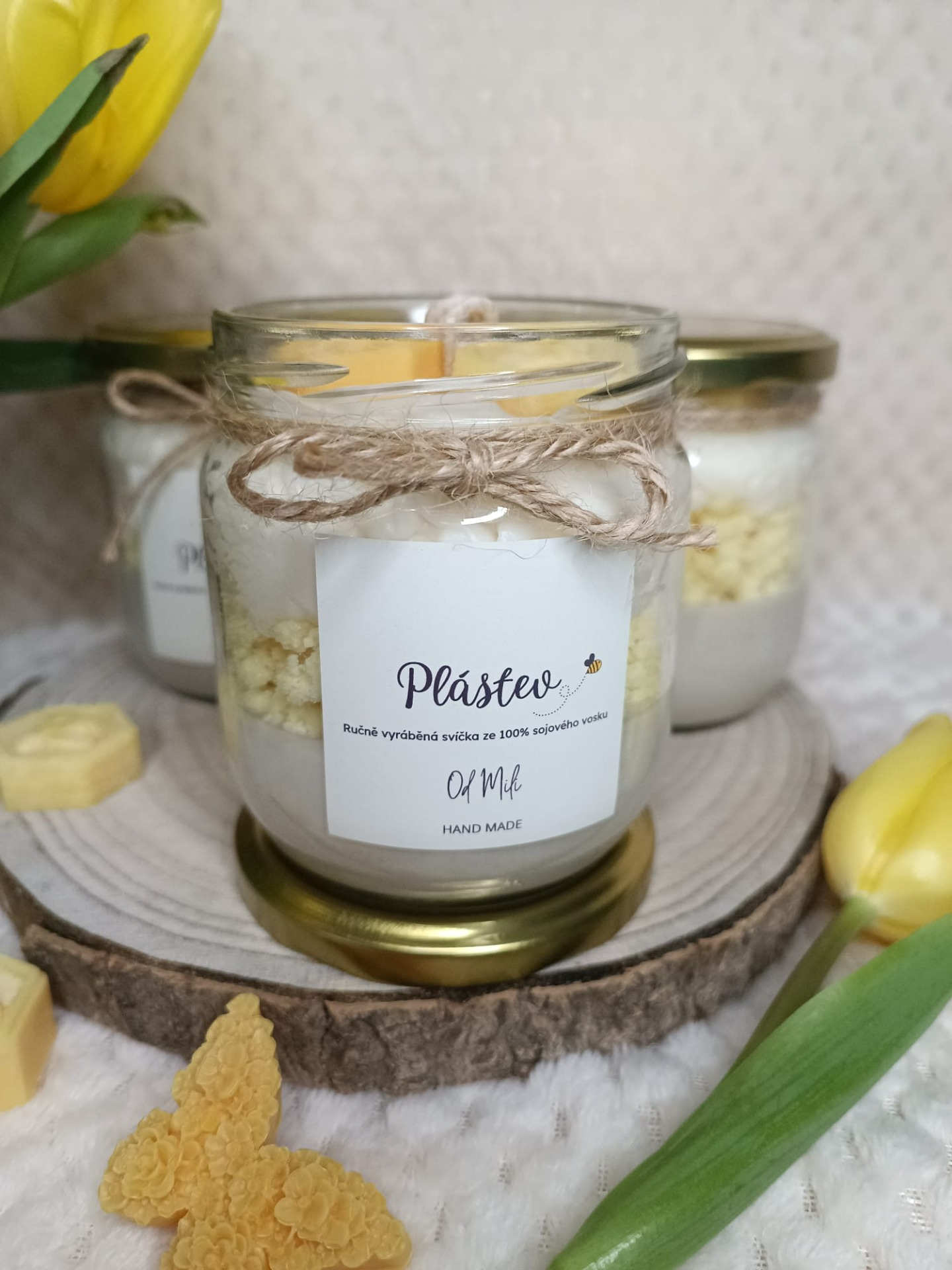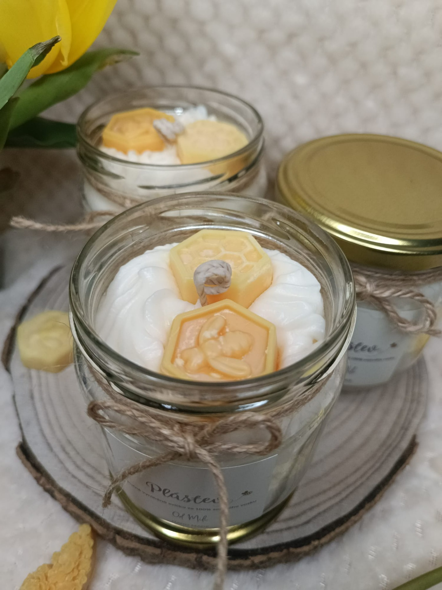 Sójová svíčka inspirovaná včelí pláství, doplněná přírodním provázkem a zlatým víčkem.