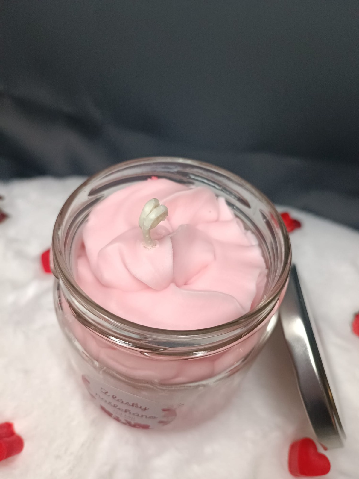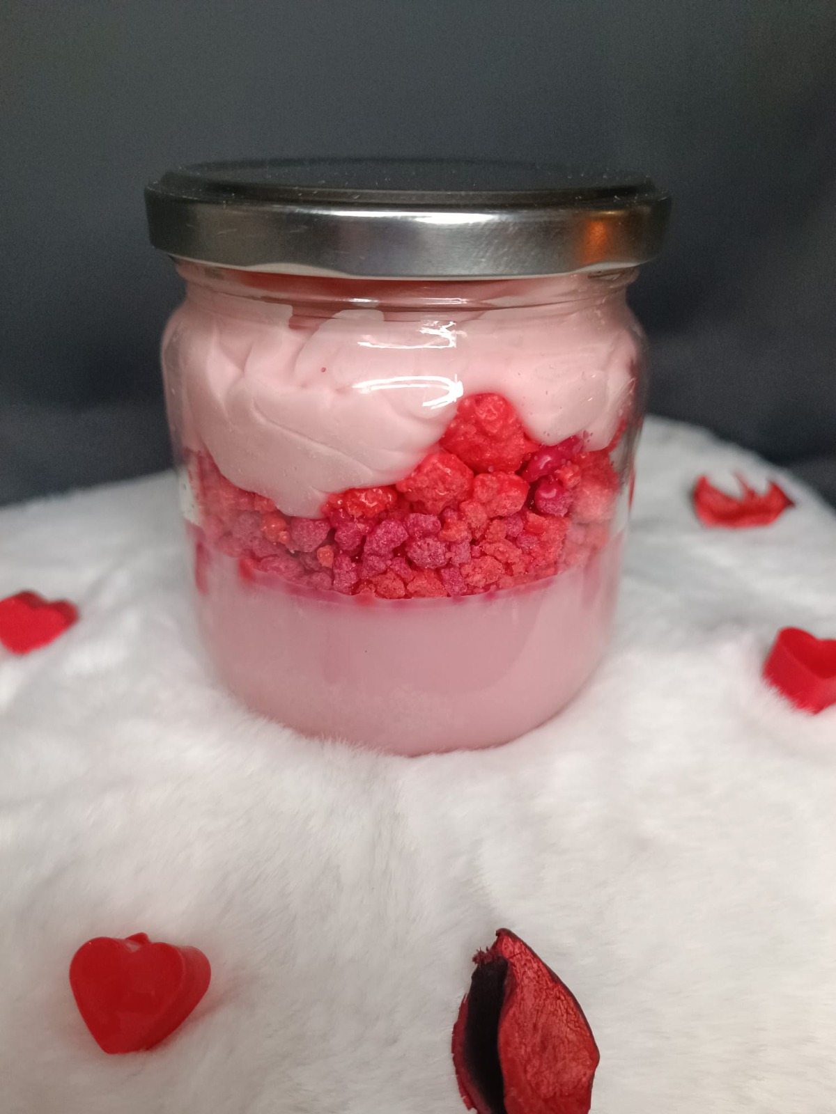 Dekorativní svíčka v typicky valentýnském růžovém tónu. Kombinace tří struktur vosku – litý základ, šlehaný povrch a jemně drobený detail – vytváří bohatý, hravý vzhled. Sladká vůně jahody dodává svíčce lehkost a romantickou atmosféru.
